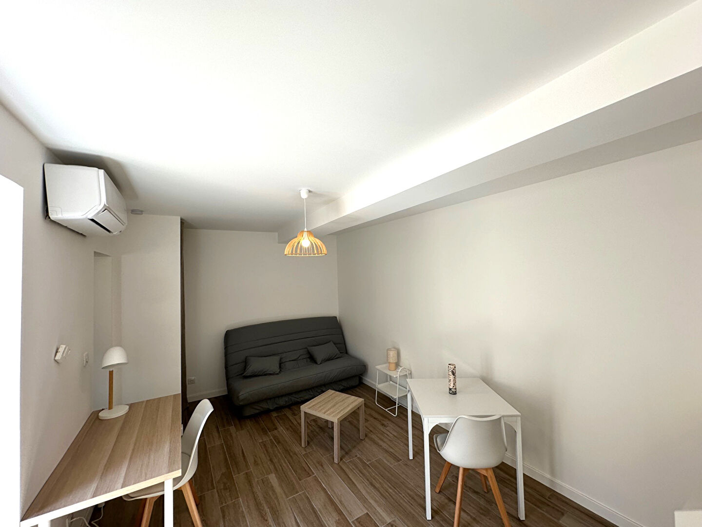 Location studio meublé 29 m² avec cour privative au rez de chaussée quartier Capucins Carcassonne proche centre ville. Carcassonne, quartier des Capucins. Studio meublé de 29 m² à louer, situé en rez-de-chaussée dans un petit collectif de trois logements. Appartement entièrement rénové, entrée donnant sur une pièce principale lumineuse avec coin cuisine équipé comprenant plaque, hotte, frigo-top, micro-ondes et rangements. Salle d'eau avec WC et lave-linge. Cour privative attenante offrant un espace extérieur. Confort moderne assuré par double vitrage et climatisation réversible. Mobilier neuf et pratique. Environnement résidentiel calme, proche du centre ville et des commodités immédiates. Logement fonctionnel et prêt à l'emploi.